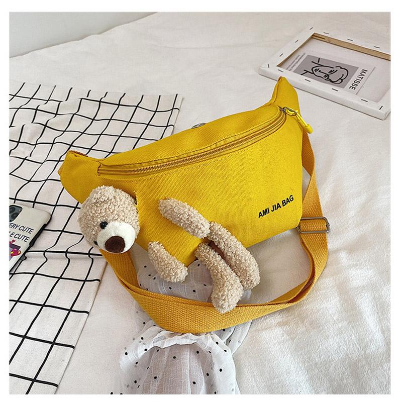 Material: The Cartoon Bear Shoulder Bag is made of polyester fiber and has an opening for the earphone hole. It is very convenient to listen to music. The shoulder bag size of the cartoon bear is 11 * 5.9 * 2inches.