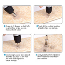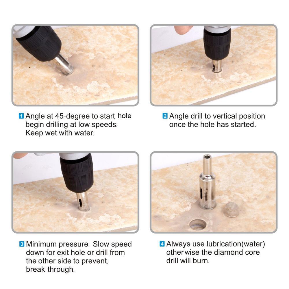 Please keeping adding water while drilling hole to ensure the bit keeps cool. Using speed under in 800-1000 per minute.