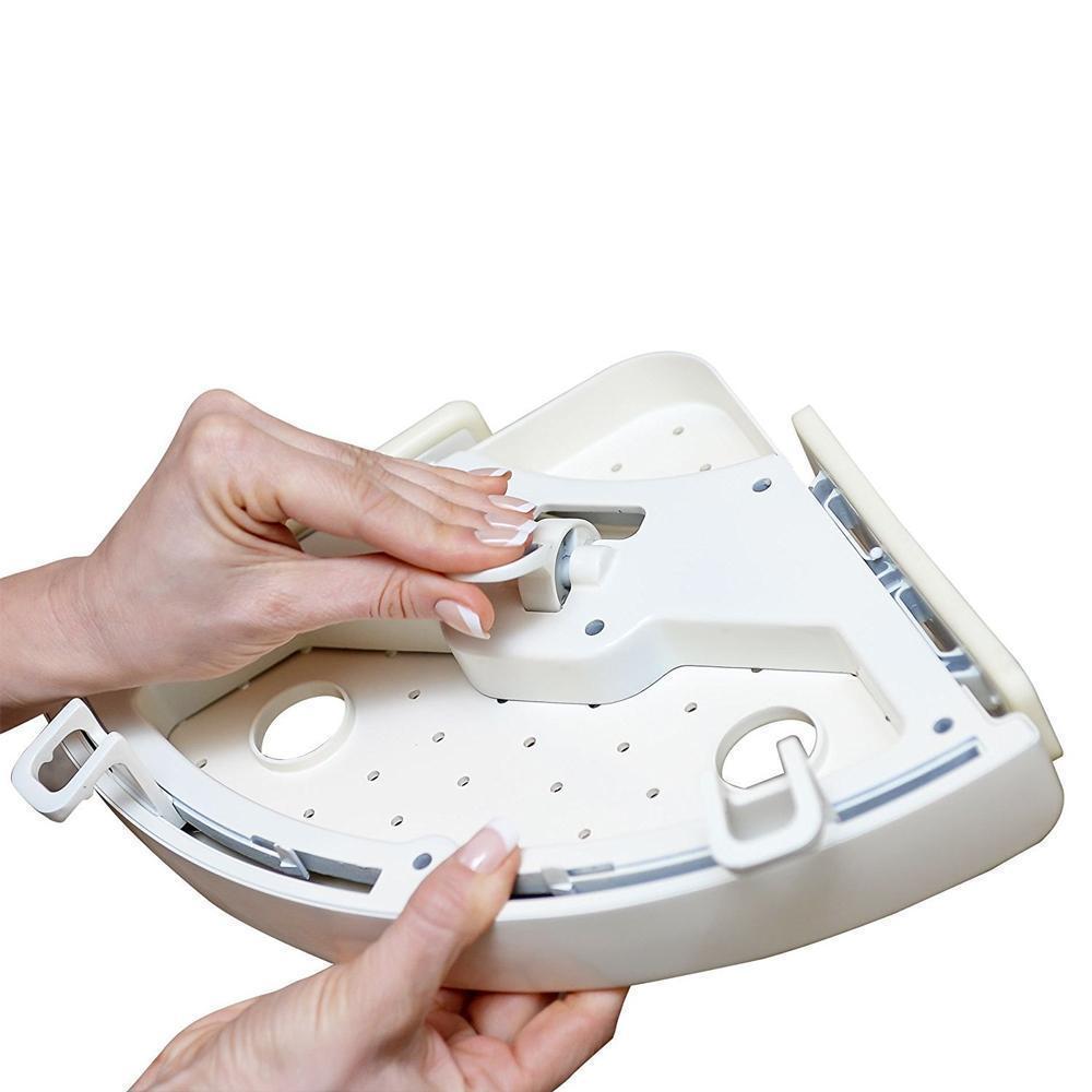 - Installation: No need of glues, screws and other tools. Just put the shelf in the corner and turn the handle in the bottom.