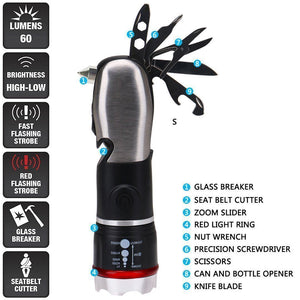 - 🔪ALL-IN-ONE FOR CONVENIENCE- This multifunctional light features all the important tools you may need, all in one place. It includes a 100 lumen zoomable LED flashlight, a glass breaker, seat belt cutter, knife blade, precision screwdriver, scissors, a can and bottle opener, red light ring, and a nut wrench. Having all the tools in one place helps to improve the ease access when you need it!