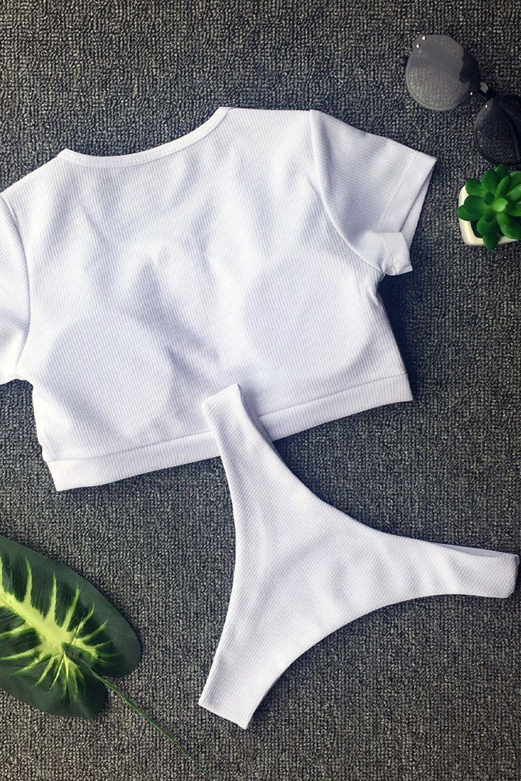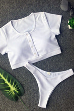 Athletic two piece swimsuit in solid color, details include a cropped t-shirt style bikini top with pad cups, short sleeves and single-breasted buttons on the front, complete the sporty look with a pair of thong bottom in high cut leg. Designed in stretch ribbed fabrication.