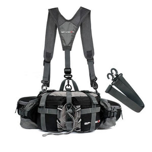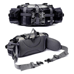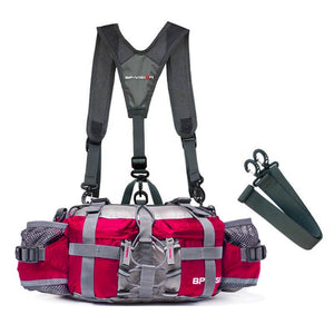 Wear-resistant nylon, breathable mesh lumbar, external organizable adjustment belt, dual water bottle holders, three exterior front zipper pockets, two exterior side zipper pockets to keep your stuff separate and organized.