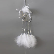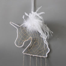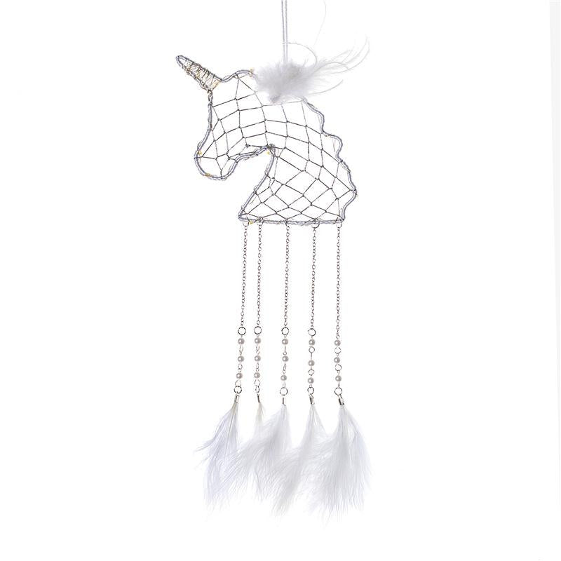 - Made of unicorn shape metal circle, decorative feathers, beads, LED string light. (Warm white, Battery powered)