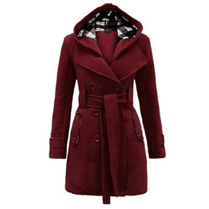 Women Double Breasted Slim Hoodie Solid Casual Long Pea Coat with Belt